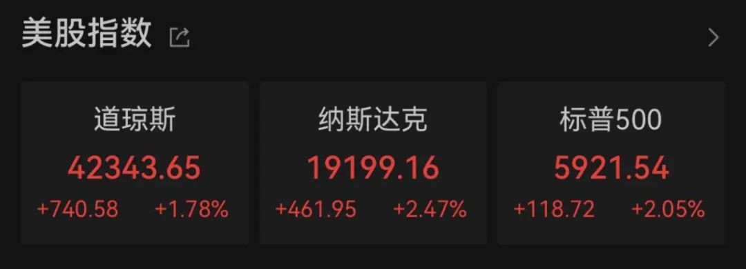 道指涨740.58点,涨幅为1.78%,报42343.65点;纳指涨461.96点,涨幅为2.47%,报19199.16点;标普500指数涨118.72点,涨幅为2.05%,报5921.54点。