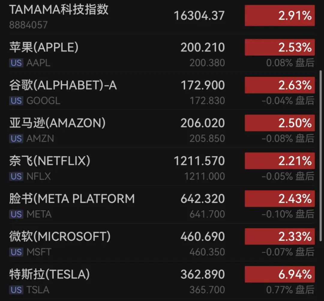 美股大型科技股全线上涨,特斯拉涨逾6%,英伟达涨逾3%,谷歌涨逾2%,苹果涨逾2%,亚马逊涨逾2%,脸书涨逾2%,微软涨逾2%。