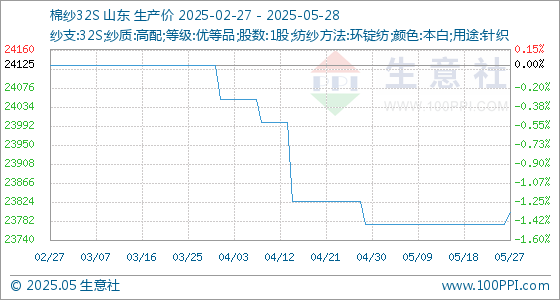 5月28日,生意社棉纱32S基准价为23800.00元/吨,与本月初(23775.00元/吨)相比,上涨了0.11%。