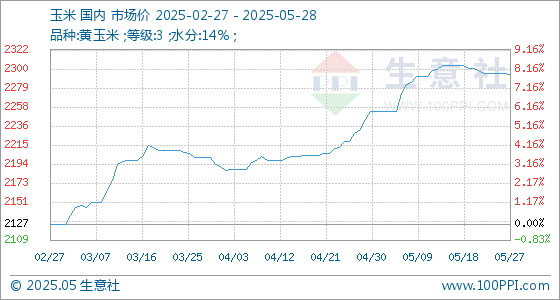5月28日,生意社玉米基准价为2294.29元/吨,与本月初(2252.86元/吨)相比,上涨了1.84%。