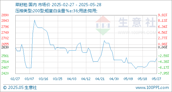 5月28日,生意社菜籽粕基准价为2543.33元/吨,与本月初(2531.67元/吨)相比,上涨了0.46%。