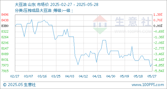 5月28日,生意社大豆油基准价为7994.00元/吨,与本月初(8126.00元/吨)相比,下降了-1.62%。