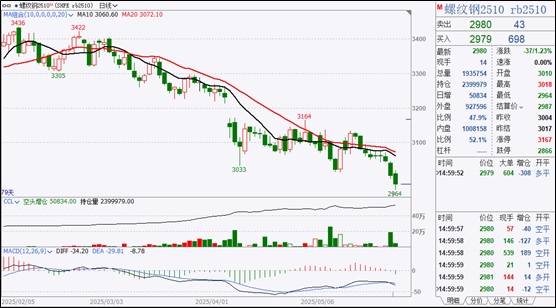 2025年5月27日,上期所螺纹钢RB2510期货合约增仓下行,期价跌破关键价位3000。截至收盘,RB2510合约报收2980元/吨,下跌37元/吨,日跌幅1.23%,日增仓50834手。10月合约两个交易日增仓近20万手。