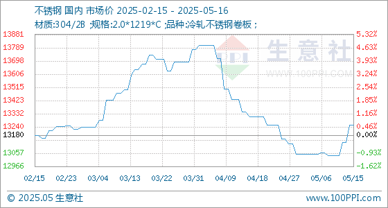 5月16日生意社不锈钢基准价为13255.00元/吨