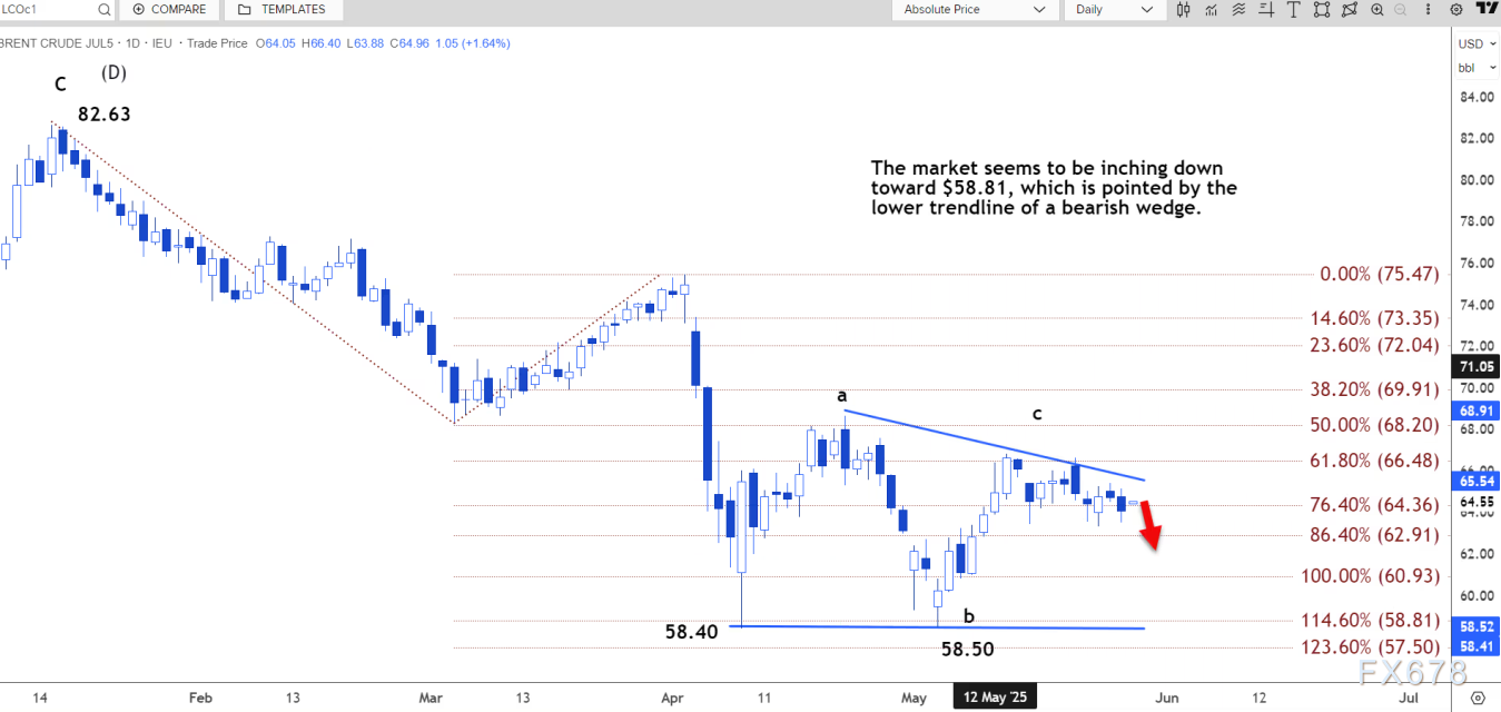跌破 64.04 美元将预示下行趋势将延续,跌向 62.76 美元至 63.25 美元区间。日线图显示,市场似乎正缓慢下行至 58.81 美元,该位置由看跌楔形的下趋势线指向。