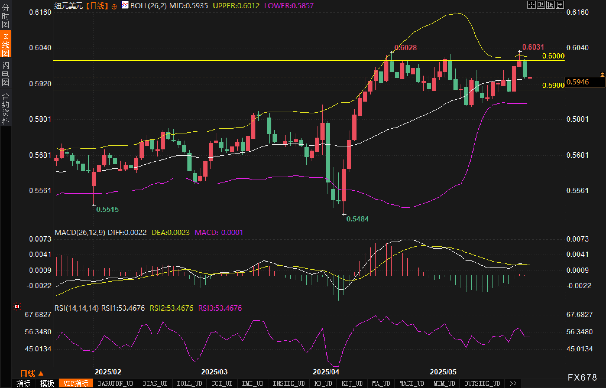 日线图显示,纽元兑美元突破0.6000整数关口后继续上行,最高触及0.6031。汇价运行在上升通道内,布林带中轨0.5935提供动态支撑。MACD指标在零轴上方运行,DIFF线为0.0022,DEA线为0.0023;RSI(14)指标读数53.4676,处于中性偏强区域,暂无超买信号。