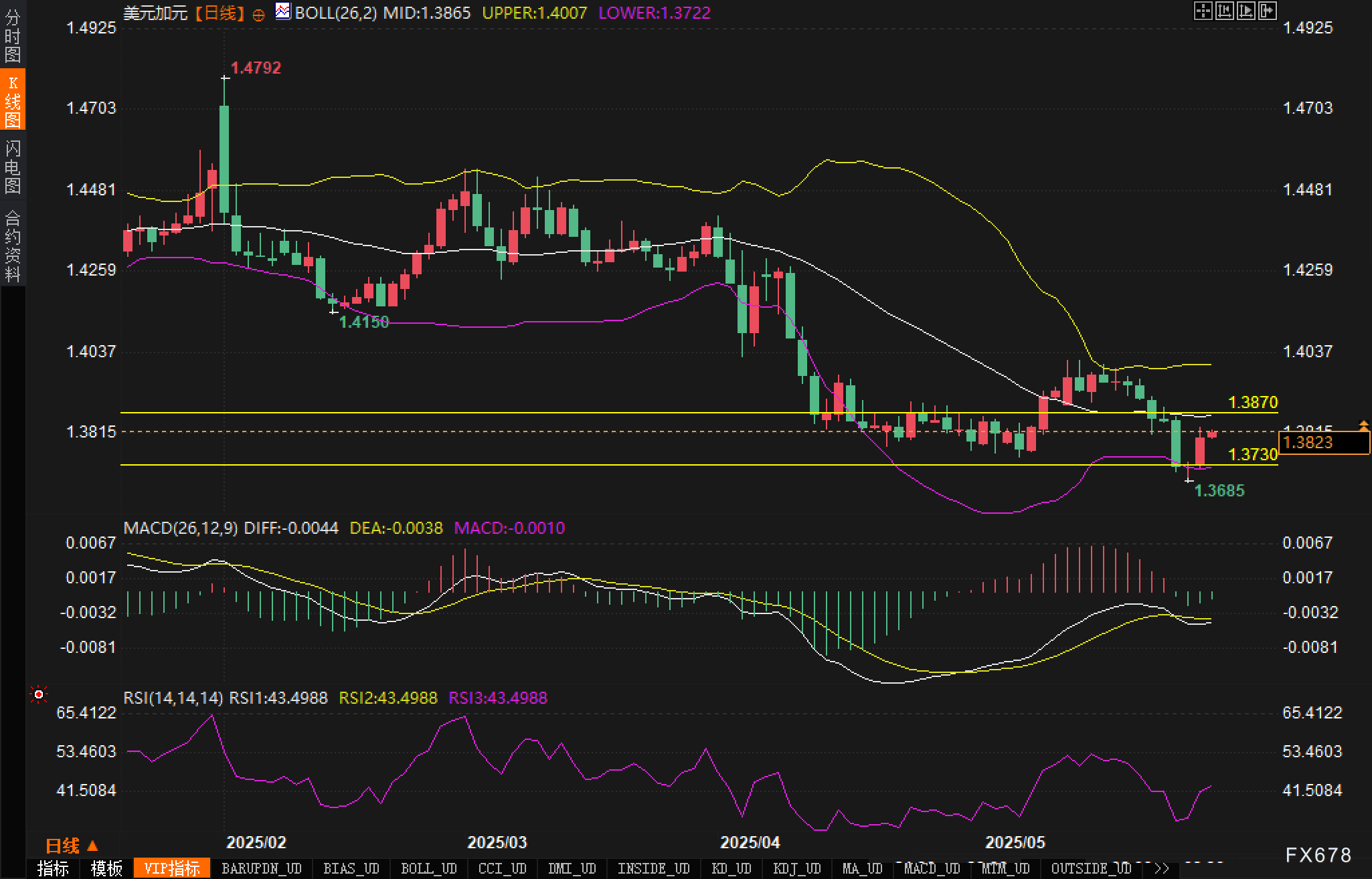 短期展望:汇价在1.3730-1.3870区间内震荡整理的可能性较大。若美元获得进一步支撑,突破1.3870阻力后有望测试1.4007。但需警惕加拿大GDP数据超预期可能引发的加元反弹。