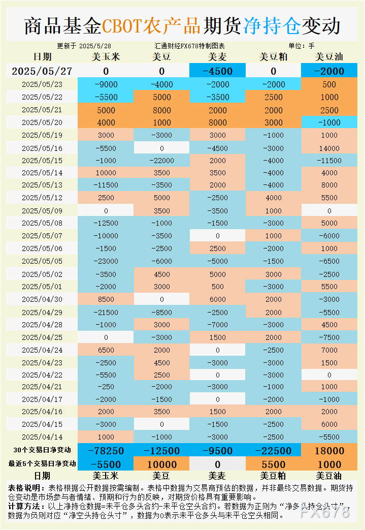 汇通财经APP讯——周三(5月28日),芝加哥期货交易所(CBOT)谷物与油籽期货市场呈现震荡分化的走势,市场情绪受到美国作物评级、国际供需动态及持仓调整的综合影响。小麦期货因美国作物评级低于预期而小幅反弹,玉米期货受播种进度放缓支撑,微幅上涨,而大豆和豆粕市场则因南美供应压力和关税言论缓和而波动有限,豆油则受到外部植物油市场走强的提振。持仓数据显示,大宗商品基金在小麦和豆油市场增加净空头,反映出谨慎的市场情绪,而玉米、大豆和豆粕的多空持仓平衡则暗示市场方向尚未明朗。本文将结合最新持仓变动、基差动态及基本面因素,深入分析小麦、大豆、玉米、豆油和豆粕的期货市场走势,并展望未来方向。