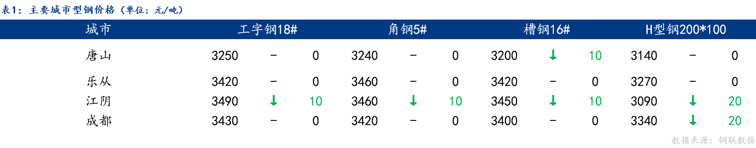 全国主要城市型钢价格稳中下跌10-20元/吨。