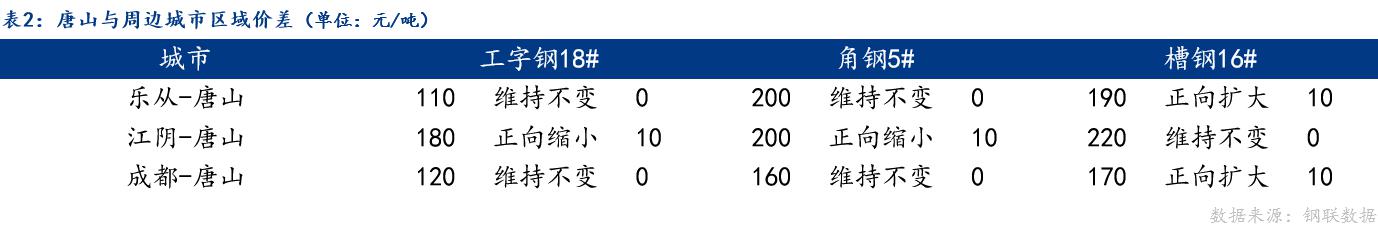 从区域价差来看,乐从市场工字钢、角钢,江阴市场槽钢,成都市场工字钢、角钢与唐山价差维持不变;乐从市场槽钢、成都市场槽钢与唐山价差正向扩大;江阴市场工字钢、角钢与唐山价差正向缩小。