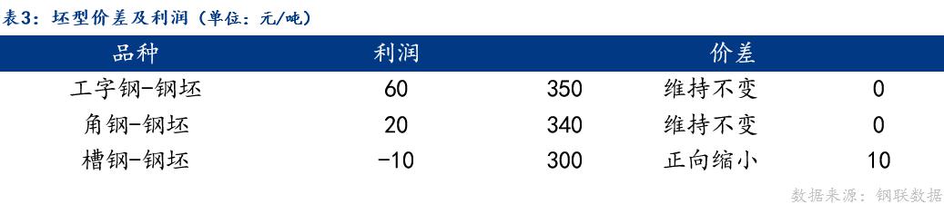 从坯材价差来看,工字钢、角钢与钢坯维持不变,槽钢与钢坯价差正向缩小。