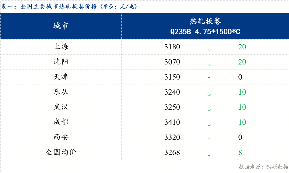 今日热轧板卷全国主要城市价格小幅下跌,截止发稿时3.0mm热轧板卷全国均价3324元/吨,较上个交易日下跌9元/吨。4.75mm热轧板卷全国均价3267元/吨,较上个交易日下跌9元/吨。今日黑色商品期货低位震荡运行,热卷10合约收跌0.55%,市场避险情绪显著升温,现货价格延续下跌,整体成交偏弱。