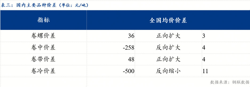 从品种价差来看,卷螺差较上一交易日正向扩大1元/吨,热中价差较上一交易日反向扩大4元/吨,热带价差较上一交易日正向扩大4元/吨,热冷价差较上一交易日反向缩小11元/吨 。