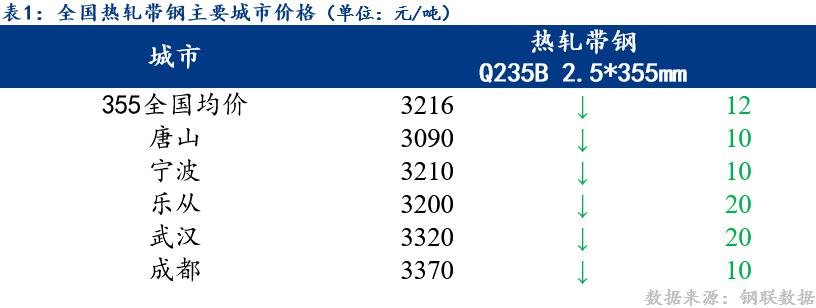 28日热轧带钢全国主要城市价格震荡下行,截至发稿时2.5*355mm热轧带钢均价3216元/吨,较昨下跌12元/吨,其中2.5*355mm主要城市报价为唐山3090元/吨,宁波3210元/吨,乐从3200元/吨。