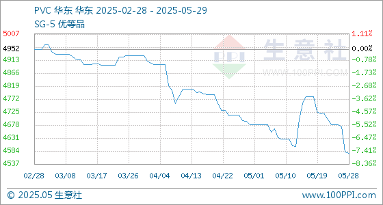 5月29日,生意社PVC基准价为4577.00元/吨,与本月初(4679.00元/吨)相比,下降了-2.18%。