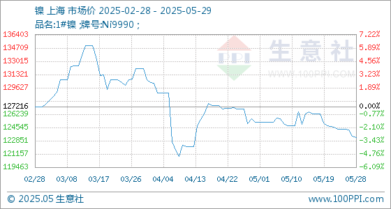 5月29日,生意社镍基准价为123283.33元/吨,与本月初(125175.00元/吨)相比,下降了-1.51%。