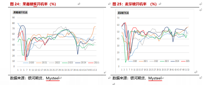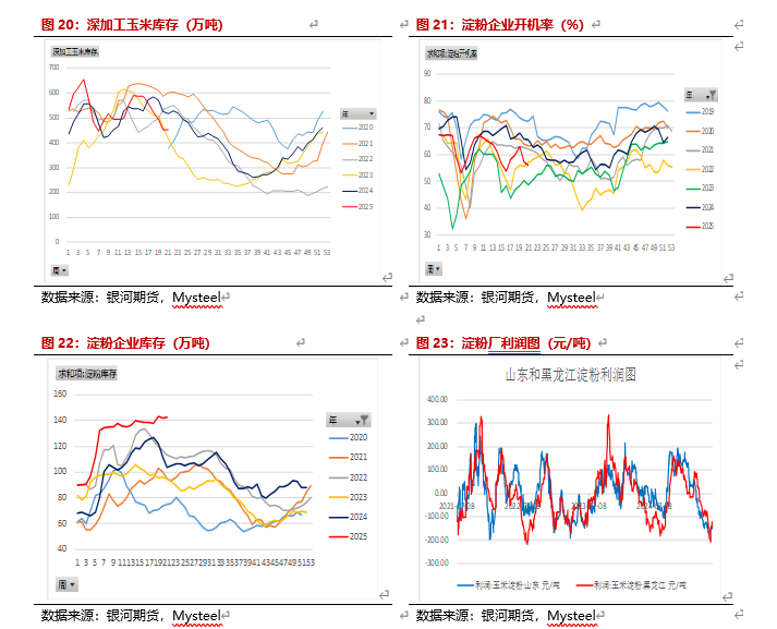 2025年5月玉米价格继续上涨,副产品相对稳定,淀粉利润亏损扩大,开机率也开始降低,玉米库存偏低。截止5月21日,96家深加工玉米库存453.5万吨,低于上月同期的588.7万吨,也高于去年同期的518.4万吨。黑龙江玉米库存116.8万吨,低于去年的14.2%,山东玉米库存95.5万吨,低于去年18.2%。淀粉企业开机率降低,截止5月23日,淀粉企业开机率为55.88%。淀粉企业淀粉库存高于去年,淀粉企业亏损加大。截止5月23日,黑龙江淀粉利润为-125元/吨,山东利润-154元/吨。淀粉库存维持高位,库存高于去年,截止5月21日,淀粉库存为142.9万吨,月增幅3.03%,年同比增幅37.4%。由于全行业亏损较大,预计开机率会持续下滑,预计6月淀粉库存会下降,6月淀粉利润可能会有所增加。