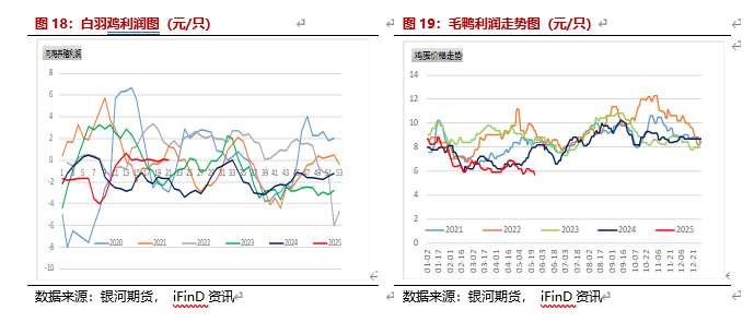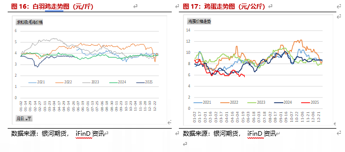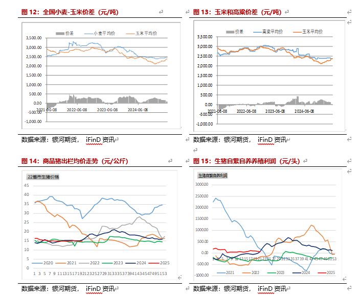 饲料需求继续增长。根据饲料工业协会数据,4月饲料产量2753万吨,1-4月累计10315万吨,同比增10.7%。国家统计局显示,4月饲料产量2664万吨,1-4月累计10403万吨,同比增7.7%。生猪养殖利润略下降,生猪存栏高于去年同期。截止5月23日,自繁自养利润每头104元,外购利润46元。4月123价规模场商品猪存栏3548.24万头,环比增加0.1%,同比增6.28%。白羽肉鸡进入5月盈利稳定,截止5月23日,养殖利润0.24元/只,鸡蛋养殖利润截止5月23日为-0.36元/斤,蛋鸡存栏也持续增加,根据卓创数据,2025年5-8月蛋鸡存栏为13.32亿只、13.37亿只、13.45亿只和13.49亿只。由于玉米与小麦价差较低,部分小麦替代玉米量较高,初步测算,小麦替代玉米30%左右。