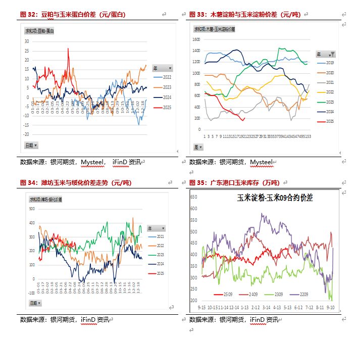 2025年6月基层余粮继续减少,华北玉米开始紧缺,玉米现货仍有上涨空间。今年交易的焦点仍是华北玉米紧缺,今年的数据与23年类似,基层粮源要低于23年。由于进口谷物大幅减少,华北玉米减少,华北玉米仍会紧张,华北小麦可能会相对稳定,由于华北玉米和小麦价差在50左右,预计6月玉米与小麦价差仍可能缩到0附近。华北玉米与东北玉米价差仍会处于高位(高于与东北的运费),华北玉米与北港及盘面价差会扩大。对于玉米淀粉,由于目前库存仍较高,副产品价格相对稳定,淀粉亏损扩大,6月淀粉企业会停机保利润。预计淀粉与玉米价差仍会维持高位,预计山东玉米和淀粉价差在400附近有支撑,黑龙江玉米和淀粉价差也在450有支撑。07淀粉考虑到仓单量较大,07玉米和淀粉价差可能维持低位,但09玉米和淀粉价差也会维持窄幅区间,只能当成震荡操作,预计09玉米和淀粉价差在360-430之间震荡。