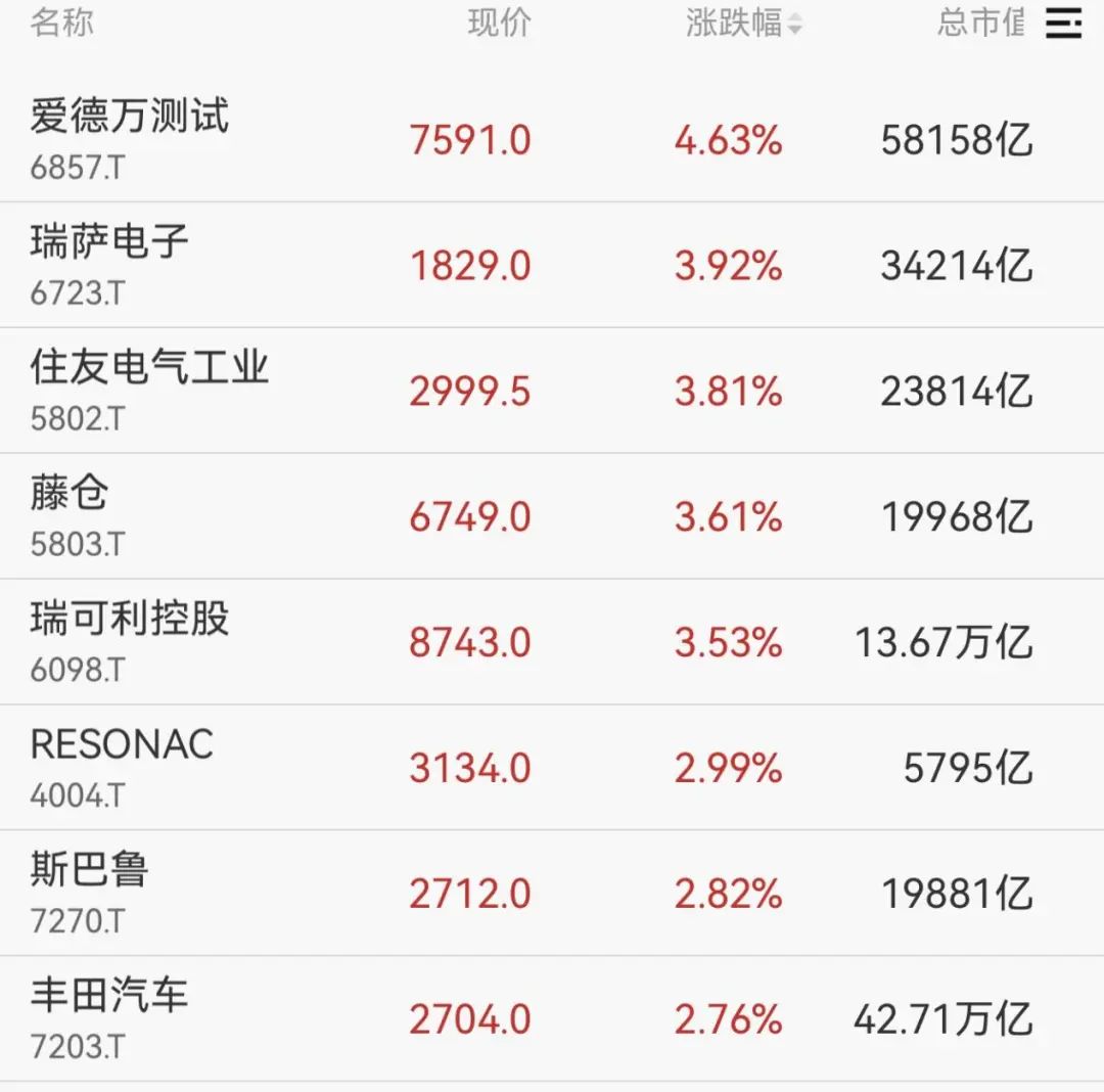 个股方面,芯片股及汽车股领涨,爱德万测试、瑞萨电子、斯巴鲁、丰田汽车等涨超2%。