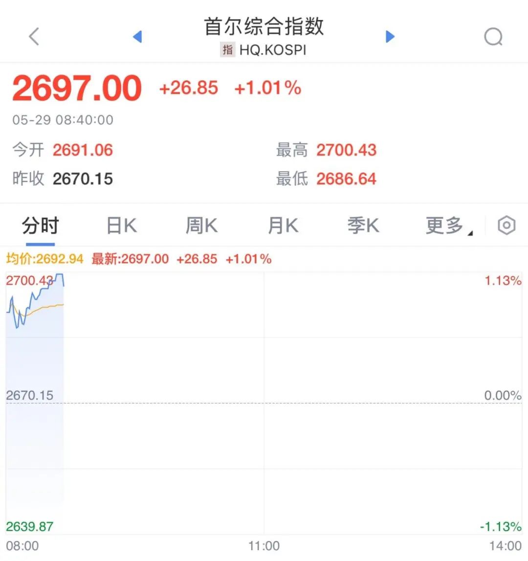 此外,韩国KOSPI指数震荡拉升,涨超1%。