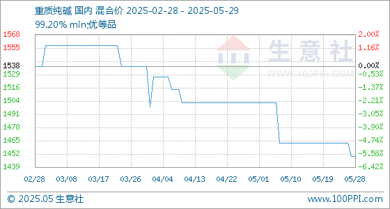 5月29日,生意社重质纯碱基准价为1450.00元/吨,与本月初(1502.50元/吨)相比,下降了-3.49%。