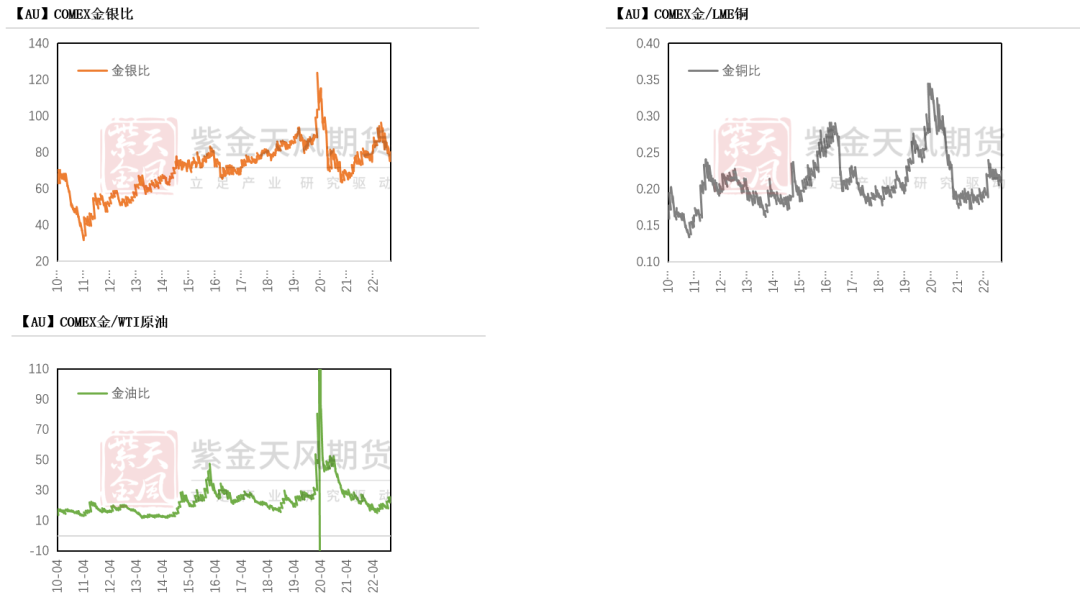金银比震荡走高,主要因为上周黄金上涨幅度大于白银;金铜比走高,主要因为上周黄金上涨幅度大于铜;金油比环比走低,主要因为布油下跌、黄金上涨。