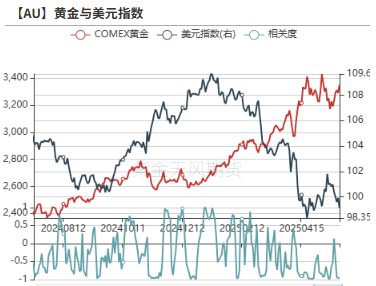 上周美元指数与黄金价格反向变动,黄金上涨4.86%,美元指数下行1.84%至99.12,两者滚动相关性上升。