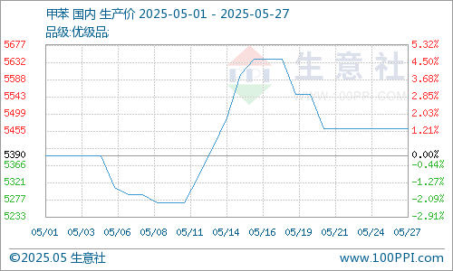 据生意社商品行情分析系统显示,2025年5月甲苯市场先涨后跌,小幅上涨。5月1日至28日,国内甲苯市场价格自5390元/吨涨至5470元/吨周期内价格上涨1.48%。