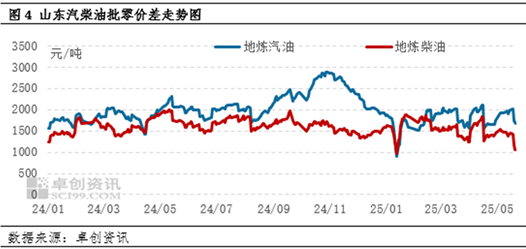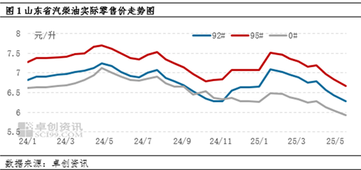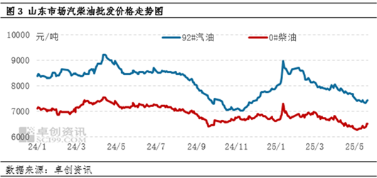 5月上旬因对等关税以及欧佩克+增产预期引发的市场担忧情绪持续发酵,国际油价延续前期下跌走势。中下旬由于中美贸易关系缓和,并且美国夏季需求预期仍存向好发展预期,国际油价震荡上涨,其中“四连涨”累计涨幅超过5美元/桶,对批发价格短时指引偏强。国内成品油零售价调整跟随国际油价走势,5月国内零售价历经一次下调,此次下调也是年内第5次下调,其中汽油下调230元/吨,柴油下调220元/吨,折升价后,92#汽油、95#汽油、0#柴油分别下调0.18、0.19、0.19元。中上旬下调预期笼罩市场,业者操作心态偏空,在5月19日24时零售价调整之后,国内多数地区92#汽油零售价在时隔三年以来再次进入“6元时代”。山东省最高零售限价下跌,民营加油站为增强自身竞争优势,及时下调销售策略,以吸引更多车主进站加油。