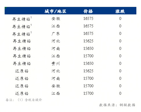 安徽市场A企业再生精铅含税价16575元/吨出厂成交200吨,下游刚需接货,炼企仍存惜售情绪,出货意愿欠佳。
