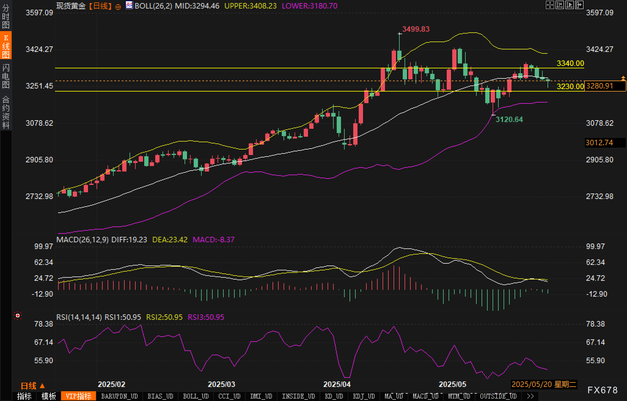 从日线图来看,金价在3499.83美元见顶后展开调整,目前运行在3230-3340美元的横盘区间内。布林带显示上轨位于3408.23美元,中轨在3294.46美元,下轨支撑在3180.70美元。价格目前处于中轨下方,暗示短期偏弱格局。