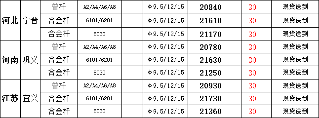 5月29日宁晋市场普铝杆现货报盘价20840元/吨,较上一交易日报价涨30元/吨;巩义市场普铝杆现货报盘价20780元/吨,较上一交易日报价涨30元/吨;宜兴市场普铝杆报盘价20930元/吨,较上一交易日报价涨30元/吨。