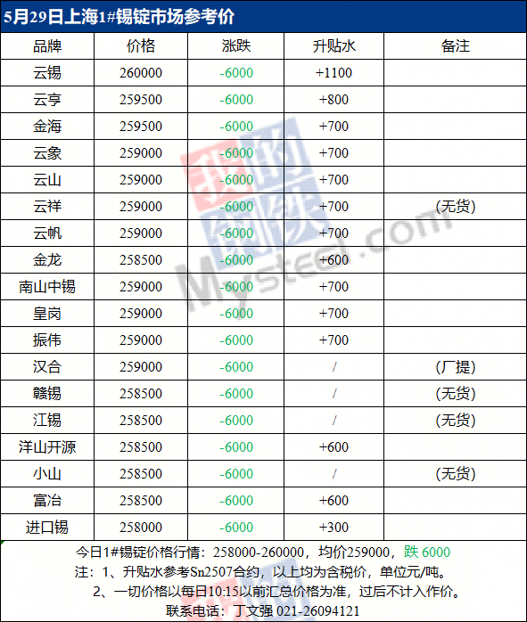 5月29日Mysteel上海现货锡锭报价258000-260000元/吨,均价259000元/吨,较上一交易日跌6000元/吨,Mysteel15:30上海现货锡锭成交价格257000-260000元/吨,均价258500元/吨,较上一交易日跌3000元/吨。