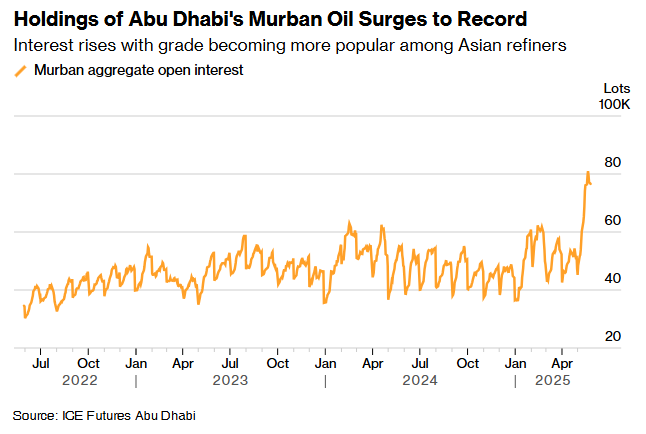 随着OPEC+提高供应配额,阿联酋旗舰原油的交易活动在本月飙升至有记录以来的最高水平。交易所数据显示,阿布扎比国际期货交易所的Murban原油期货全曲线的未平仓合约在本月早些时候升至8.1万手,为该合约自2021年3月推出以来的最高水平。