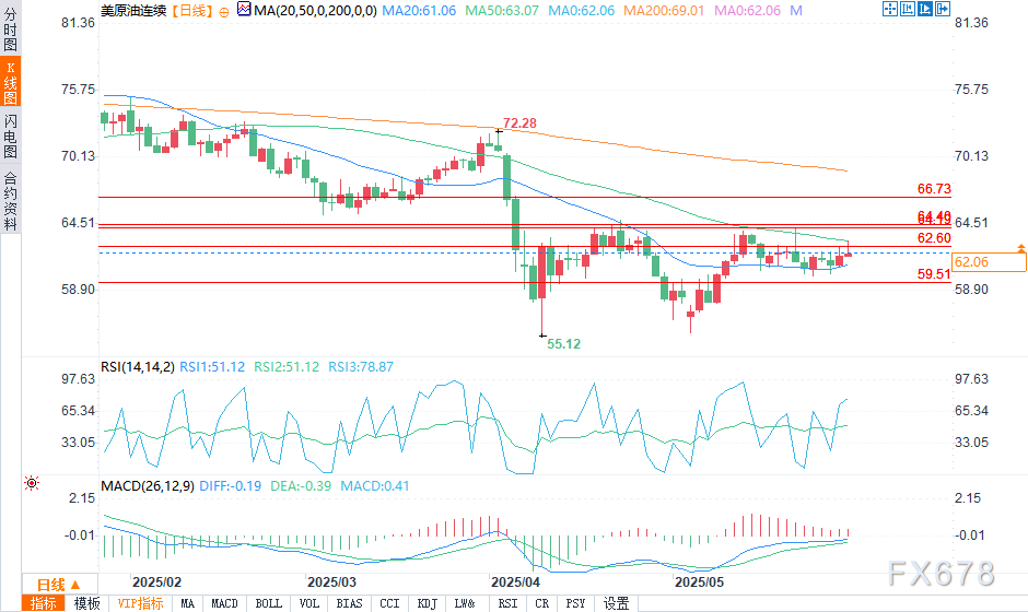 汇通财经APP讯——周四(5月29日)欧盘时段,原油期货大幅上涨,如果涨势在关键阻力位上方持续,价格有可能突破。近期技术上的关注点是62.60美元和附近62.74美元的枢轴点。