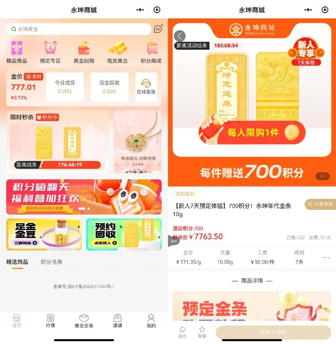 蓝鲸记者浏览永坤黄金线上商城发现,目前可预定产品已全部下架,秒杀价格为7800多元的“新人体验产品”售出超500份。五一期间,官方还推出了积分加码活动。直到20号当天,还有业务员在咨询客户要不要续存。