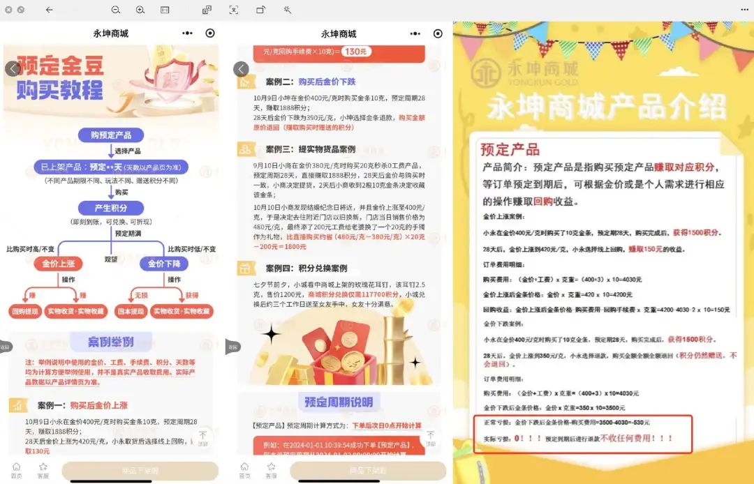 在永坤黄金线上商城,客户可以大盘金价“预定黄金”,周期从3-88天不等。所谓“预定”,是指用户无法马上获得实物黄金,到期后用户可以选择回购提现或者收下实物。