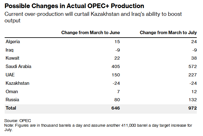若伊拉克和哈萨克斯坦的产量维持在3-4月的平均水平——伊拉克是出于遵守协议的考虑,而哈萨克斯坦则是因为“力所不能及”,其他成员国的产量从3月OPEC所宣称的实际产量水平增长至补偿调整后的目标水平,在这种情况下,到7月的产量增幅则将从137万桶/日减少至97.2万桶/日,即减少近30%。