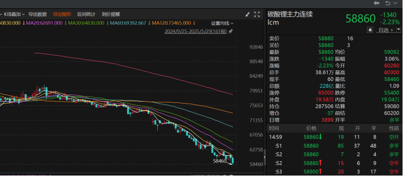 上证报中国证券网讯(记者 李少鹏)已跌破“盈亏线”碳酸锂尚未止住下跌势头。5月29日,碳酸锂期货主力合约下跌2.23%,收盘报58860元/吨,创下年内新低。据查询,碳酸锂期货合约今年来一直处于下跌状态,与年初最高点8万元/吨的价格相比,累计跌幅已达到23.66%。
