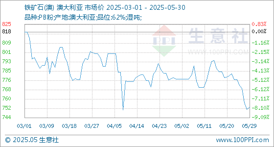 5月30日,生意社铁矿石(澳)基准价为753.67元/吨,与本月初(778.11元/吨)相比,下降了-3.14%。