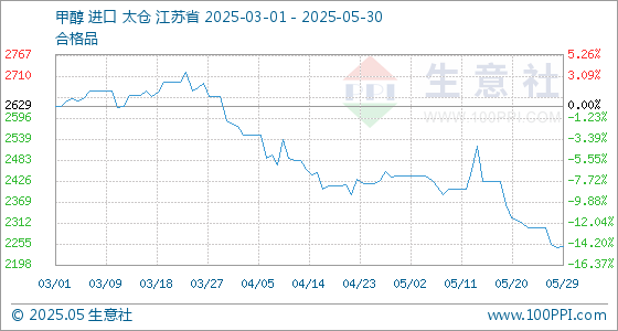 5月30日,生意社甲醇基准价为2247.00元/吨,与本月初(2440.00元/吨)相比,下降了-7.91%。