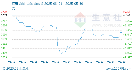 5月30日,生意社沥青基准价为3611.67元/吨,与本月初(3647.50元/吨)相比,下降了-0.98%。