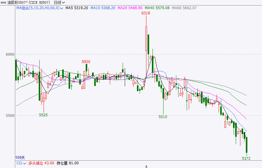 今日国内油菜籽期货合约大幅下行,截至今日收盘菜籽主力2507合约报5198元/吨,日跌135元/吨,日跌幅2.53%。