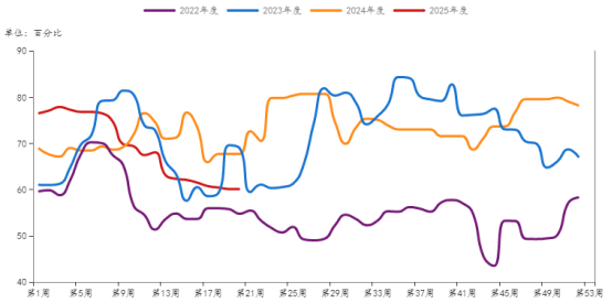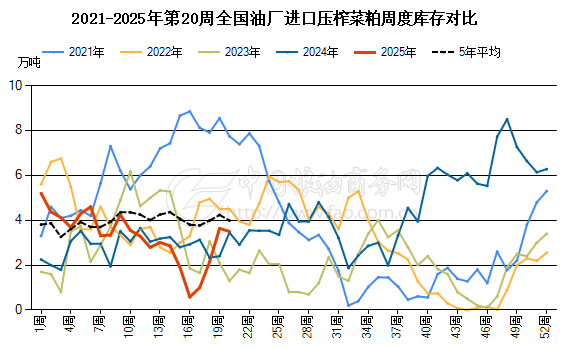 (2)下游菜粕库存粮油商务网监测数据显示,截止到2025年第20周末,国内进口压榨菜粕库存量为3.5万吨,较上周的3.6万吨减少0.1万吨,但菜粕库存同比走高,目前的库存水平已恢复至历年中等水平。