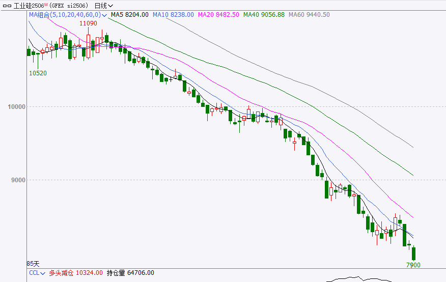 今日工业硅2506主力合约继续走弱,收盘下跌2.53%,报7910元/吨,再创历史新低,主力合约即将切换至2507合约。
