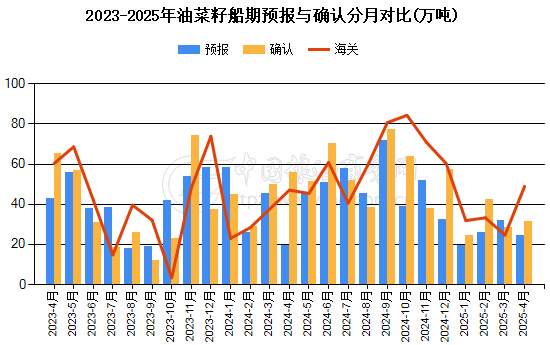 (1)海关统计数据在线查询平台公布的数据显示,中国2025年4月油菜籽进口量为489214吨,环比增长98.26%,同比增加3.92%。其中,加拿大是第一大供应国,当月从加拿大进口油菜籽476764吨,环比增加105.48%,同比增加6.97%。