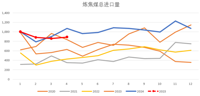 焦煤进口方面,随着国内煤价下跌,以美国和澳大利亚为代表的海运煤进口利润下降,进口量同比去年小幅下滑。今年1-4月进口焦煤总量为3633万吨,同比去年较少3%,然而这个进口量也是仅次于去年的新高,这个焦煤进口量加上国内充足的产量因此形成了供给过剩。