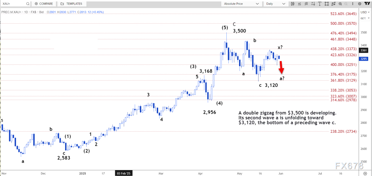 当前阻力位在 3308 美元,突破该位后,价格可能上涨至 3330 美元至 3348 美元区间。日线图上,从 3,500 美元开始的双锯齿形走势正在形成。第二波 a 浪正在向 3120 美元展开,这是 c 浪的底部。