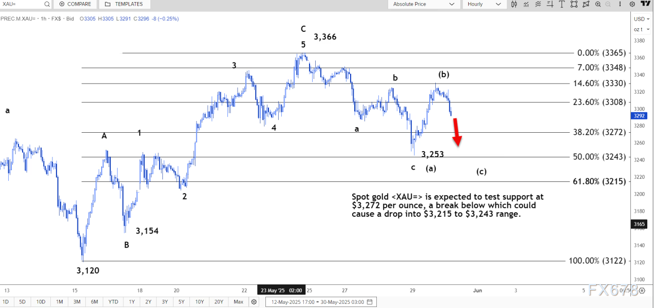 路透技术分析师指出,现货黄金预计将测试每盎司 3272 美元的支撑位,跌破该水平可能导致金价跌至 3215 美元至 3243 美元的区间。